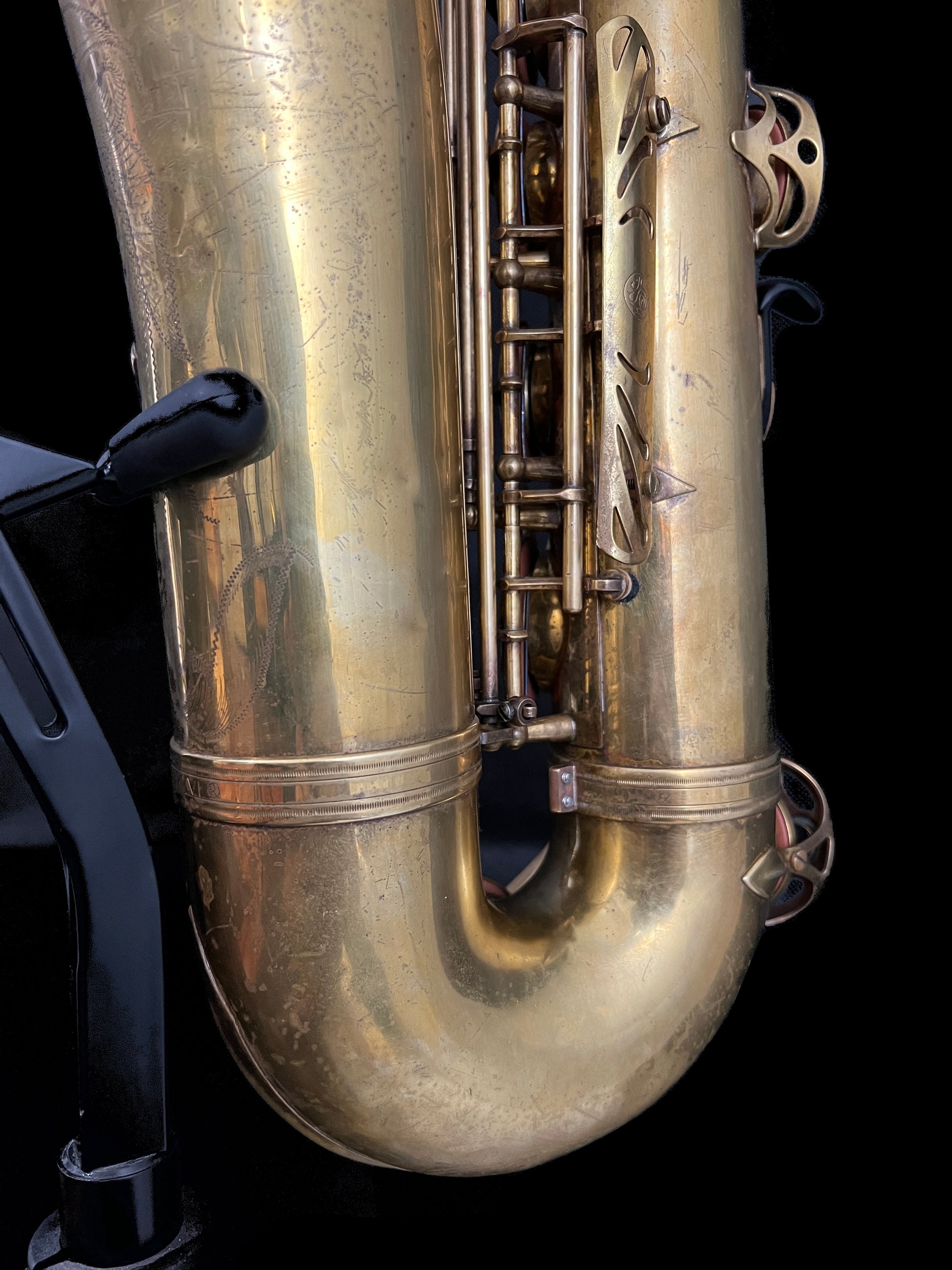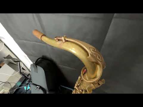 This saxophone lacked most of it's finish when we received it thus, the horn went through the standard process to remove the remaining nitrocellulose lacquer. After completely removed, the horn received a coat of renaissance wax to add a layer of protection which, will help the horn patina in a beautiful and even way that will prove unique to whomever plays this saxophone.